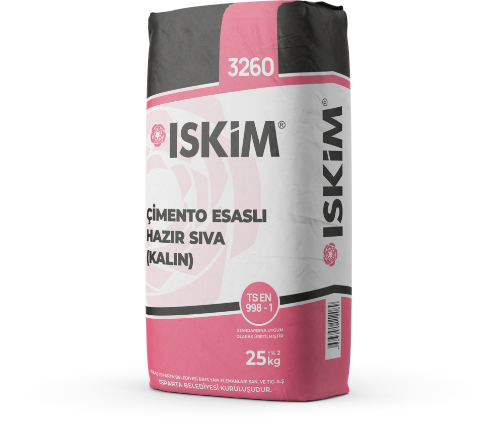 1 Torba ISKİM® Çimento Esaslı Hazır Sıva Kalın 5,5 – 6,5 litre su içerisine yavaş bir şekilde ilave edilerek macun kıvamına gelene kadar karıştırıcı ile 5 dakika karıştırılır. Hazırlanan karışım 5 dakika dinlenmeye bırakılır. Daha sonra tekrar karıştırılır. Hazırlanan harç sıva tahtasına alınarak istenilen kalınlıkta yüzeye mala ile uygulanır. Daha sonra yüzey mastarlanarak düzgün bir görünüm elde edilir. Sıva belirli bir süre çekildikten sonra (elle sertleşme kontrol edildikten sonra) kauçuk mala ile tiftiklenir. Sıvanmış yüzeyler iklim şartları göz önünde bulundurularak zaman zaman sulanması gerekebilir. Uygulamayı takip eden 2-3 gün boyunca sıva nemli tutulmalıdır.